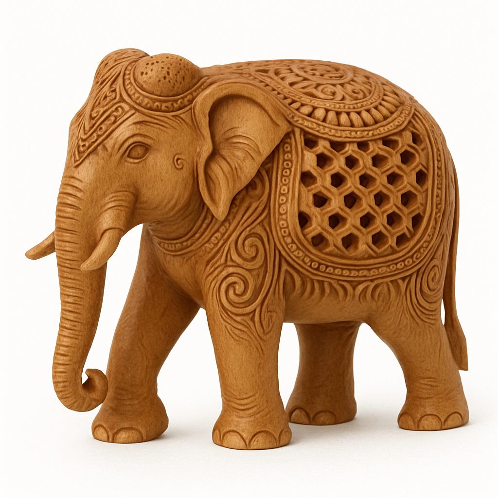 A meticulously carved wooden elephant symbolizing strength and wisdom, perfect as a decorative piece or gift.